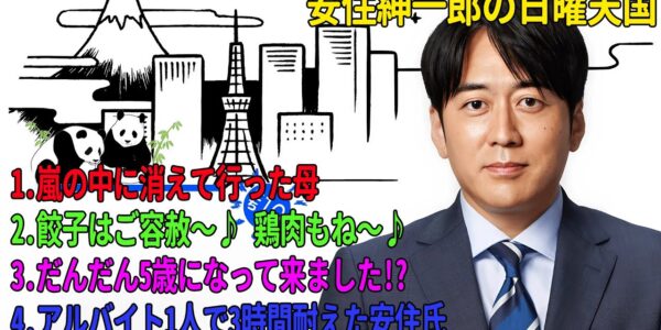 安住紳一郎の日曜天国「嵐の中に消えて行った母」「餃子はご容赦~♪ 鶏肉もね〜!」「だんだん5歳になって来ました!?」「アルバイト1人で3時間耐えた安住氏」