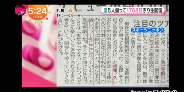 「めざましテレビ」嵐!1768日ぶり5人全員生配信!デビュー記念日に生配信!4年…