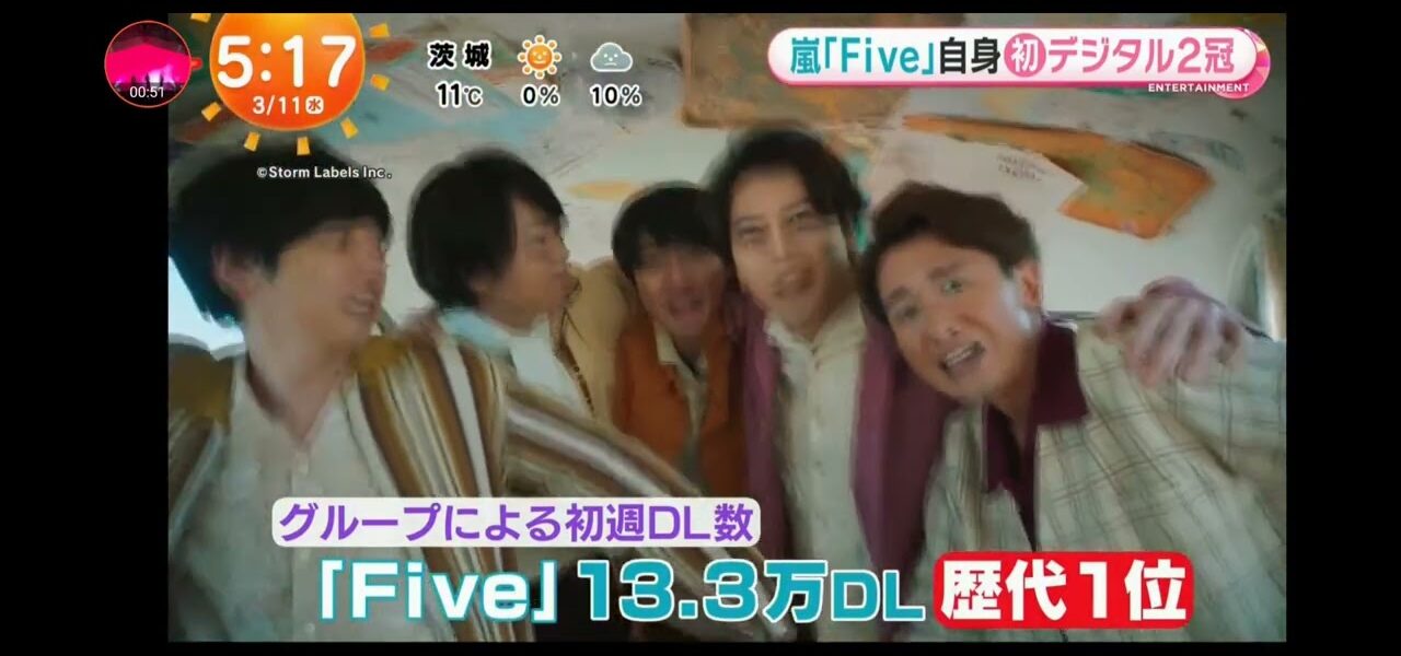 「めざましテレビ」嵐 5年ぶりの新曲「Five」!「オリコン週間ランキング」のストリーミングとデジタルシングルの2部門で1位を獲得!デジタル2冠は自身初!