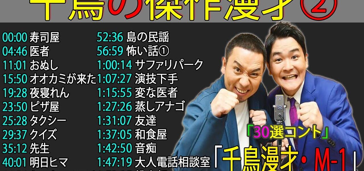 【保存版】千鳥の名作漫才&コントベスト集!笑いと癒しが同時に楽しめる【睡眠用・作業用】の高音質BGM仕様です。タイムスタンプ有りで、お気に入りの漫才やコントを簡単に再生できます。日常の疲れを笑いで癒し、心を軽くするひとときを。笑い飯や中川家が好きな方にもおすすめです