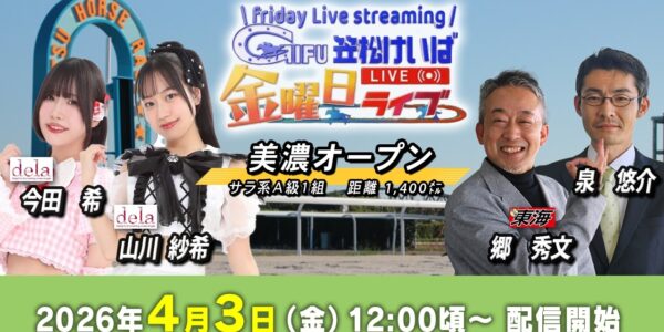 【笠松競馬】 笠松けいば金曜日ライブ 2026年4月3日(金)ー 山川 紗希(dela)/今田 希(dela)/泉 悠介(競馬実況アナ)/郷 秀文(競馬東海)