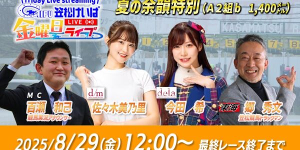 【笠松競馬】 笠松けいば金曜日ライブ 2025年8月29日(金)ー 今田 希(dela)/佐々木美乃里(d/m)/百瀬 和己(競馬実況アナ)/郷 秀文(競馬東海)