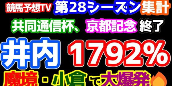 【競馬予想TV 第28シーズン集計】 井内 1792%の大的中!!🎊🎊🎊 魔境・小倉で大爆発!!🔥【共同通信杯、京都記念 終了】