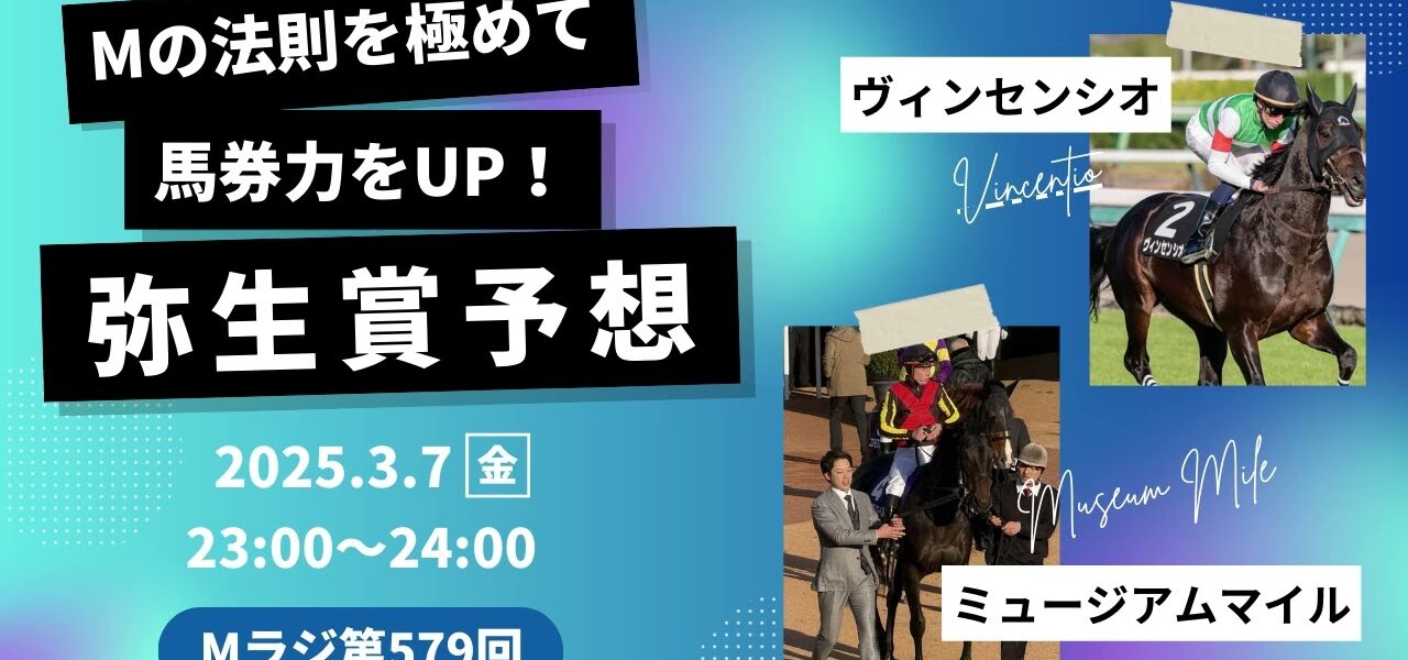 この番組は今井雅宏氏が発見した競走馬の法則である「Mの法則」を元に、MC2人とゲストの方たちが競馬予想を楽しんじゃおうというラジオ番組です。