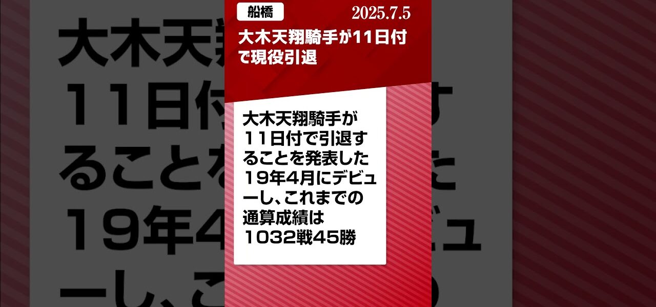 ホームページ【船橋】大木天翔騎手が11日付で現役引退|2025/7/4 #地方競馬ニュース 【船橋】大木天翔騎手が11日付で現役引退|2025/7/4 #地方競馬ニュース nogizaka 投稿日: 2025年7月5日 #Shorts #地方競馬 #船橋競馬 #競馬 #大木天翔 #引退 🖥️ 世界初地方馬主Vtuberユウマが「馬主生活」をゆるっとお届け中! 地方競馬ニュースはもちろん、愛馬の成績まとめや競馬場観戦記も投稿しています 🎬 ▶️ ぜひチャンネル登録して次の動画もお楽しみに🐴 共有: Facebook で共有するにはクリックしてください (新しいウィンドウで開きます) Facebook クリックして X で共有 (新しいウィンドウで開きます) X いいね:いいね 読み込み中… 返信する コメントをキャンセルメールアドレスが公開されることはありません。 ※ が付いている欄は必須項目ですコメント ※ 名前 ※ メール ※ サイト 次回のコメントで使用するためブラウザーに自分の名前、メールアドレス、サイトを保存する。 nogizaka すべての投稿を表示 投稿ナビゲーション 前の投稿【北九州記念】「波乱の立役者」〜穴ウマ診断〜#ラジオNIKKEI賞 #よく当たる競馬予想家 #競馬 #競馬予想 #クラスペディア#ヤマニンアルリフラ#エイシンワンド #競馬予想 #競馬 次の投稿武豊は現役伝説!60歳騎乗・引退時期・凱旋門賞【競馬、反応集】 こちらの記事はいかがですか? 【競馬講談】福永祐一引退記念講談/第十一話 サニングデール/旭堂南也 上方講談谷四座 nogizaka 2023年5月2日 【速報】和田竜二騎手、まさかの現役引退へ… nogizaka 2025年8月17日 【ゴルシとの思い出】ノリさんのコメントが笑える笑#競馬 #名馬 #ゴルシ #ゴールドシップ #横山典弘 #引退式#horse #shorts nogizaka 2025年1月26日 イクイノックス 引退式 拍手で検量室前を通り見送られる最後のシーン 2023/12/16 中山競馬場 nogizaka 2023年12月16日