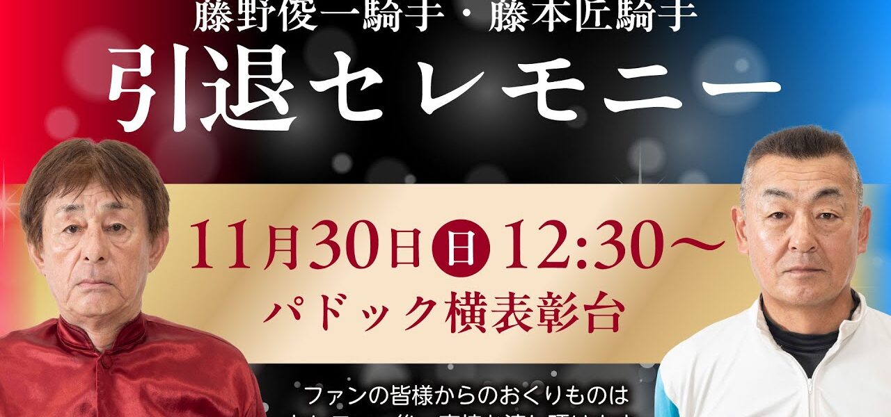 ホームページ藤野俊一騎手・藤本匠騎手 引退セレモニー 藤野俊一騎手・藤本匠騎手 引退セレモニー nogizaka 投稿日: 2025年11月30日 2025年11月30日。 長年ばんえい競馬の騎手として牽引してくれた、二人のレジェンドの引退式が執り行われました。 多くの関係者、そしてファンの皆様に祝福され、式は行われました。 次は調教師としてのご活躍を期待しております! #藤野俊一騎手 #藤本匠騎手 共有: Facebook で共有するにはクリックしてください (新しいウィンドウで開きます) Facebook クリックして X で共有 (新しいウィンドウで開きます) X いいね:いいね 読み込み中… 返信する コメントをキャンセルメールアドレスが公開されることはありません。 ※ が付いている欄は必須項目ですコメント ※ 名前 ※ メール ※ サイト 次回のコメントで使用するためブラウザーに自分の名前、メールアドレス、サイトを保存する。 nogizaka すべての投稿を表示 投稿ナビゲーション 前の投稿真夜中の ゆる~い競馬予想(聞き流し推奨) 次の投稿ジャパンカップ(GⅠ)【JFCライブ】2025/11/30(日)東京競馬ほか|JRA FUN CLUB こちらの記事はいかがですか? exショートアニメ『何年経っても』 #ソーヴァリアント #引退 #競馬 nogizaka 2024年6月5日 【競馬】テンハッピーローズ 引退…社台で繁殖入りに対する反応【反応集】 nogizaka 2025年3月8日 【ゆっくり解説】引退するサリオスについて知っておきたい3つのこと nogizaka 2022年12月3日 ナミュールが引退、繁殖入りへ #競馬 #競馬予想 #横山武史 #Cデムーロ #藤岡康太 #セリフォス #シャフリヤール nogizaka 2024年11月21日
