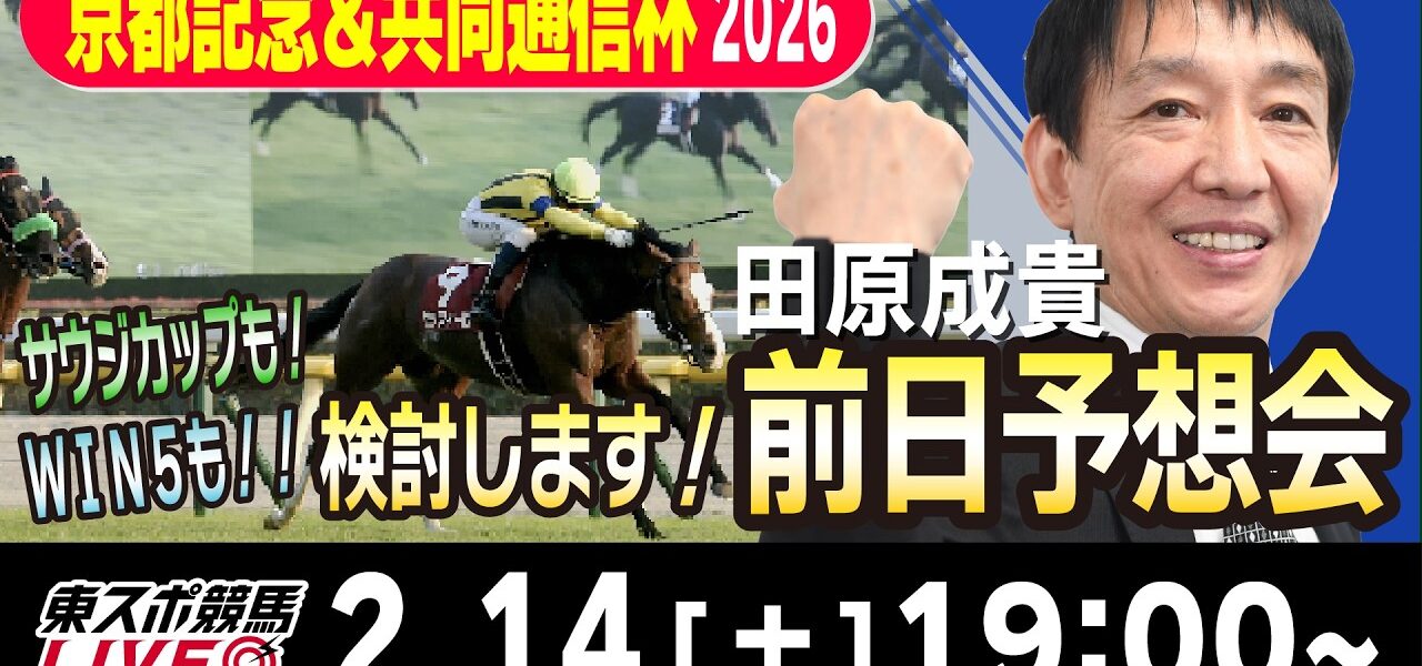 京都記念&共同通信杯をみんなで楽しく予想しましょう!5億円超がキャリーオーバーとなったWIN5、フォーエバーヤングが連覇を狙うサウジカップの検討もします!元天才ジョッキー・田原成貴氏に馬券に関する質問をドシドシお寄せください。レースと関係ない質問でもOKです!