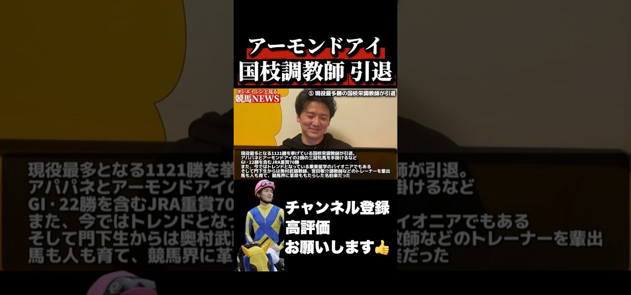 ホームページ【競馬】アーモンドアイを手がけた国枝栄調教師が引退#弥生賞 #フィリーズレビュー 【競馬】アーモンドアイを手がけた国枝栄調教師が引退#弥生賞 #フィリーズレビュー nogizaka 投稿日: 2026年3月6日 共有: Facebook で共有 (新しいウィンドウで開きます) Facebook X で共有 (新しいウィンドウで開きます) X いいね:いいね 読み込み中… 返信する コメントをキャンセルメールアドレスが公開されることはありません。 ※ が付いている欄は必須項目ですコメント ※ 名前 ※ メール ※ サイト 次回のコメントで使用するためブラウザーに自分の名前、メールアドレス、サイトを保存する。 nogizaka すべての投稿を表示 投稿ナビゲーション 前の投稿フィリーズレビュー2026【最終結論】激戦必至の前哨戦🔥2-3-1-1に該当のあの騎手騎乗馬に期待👍 次の投稿【第13回】川崎競馬公式LIVE「川崎競馬スパーキングトークLIVE GOLD」 こちらの記事はいかがですか? 20250209 競馬レーストピック 08【祝!河内調教師引退前重賞勝利!!】’25東京新聞杯 T1600 G3 ウォーターリヒト nogizaka 2025年2月9日 もしドウデュースがこれからG1勝てずに引退したらどうなる?【競馬反応集】【2chスレ】【5chスレ】 nogizaka 2024年6月29日 中央地方競馬引退ですよ🙇 nogizaka 2022年10月10日 今は立派なお父さんキタサンブラック🐴 #競馬 #shorts #馬 #キタサンブラック #引退馬 #種牡馬 #レース #動物 #可愛い #懐かしい #天皇賞 nogizaka 2024年1月17日