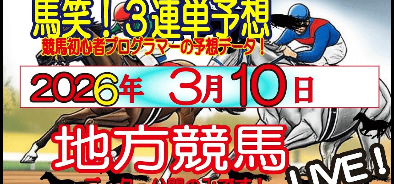 【馬笑!3連単 高配当予想 】3/10日(火曜日) 地方競馬 競馬初心者プログラマーの低配当狙いの予想をお楽しみください!