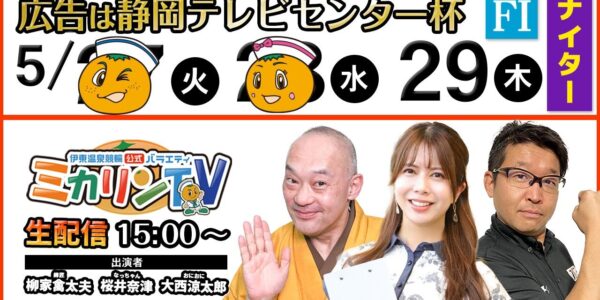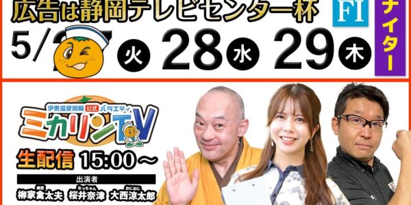 【 伊東温泉競輪公式バラエティミカリンTV】5/28(2日目)広告は静岡テレビセンター杯(FⅠナイター)出演:桜井奈津、柳家禽太夫、大西涼太郎