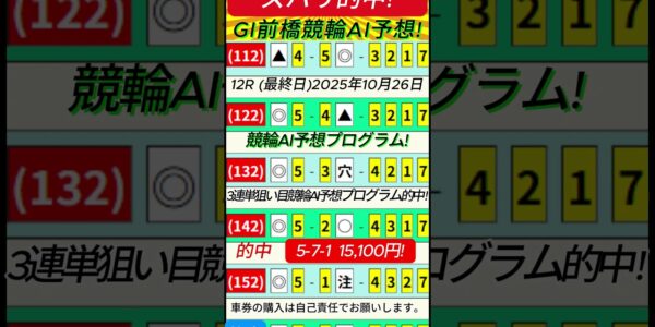勝手に競輪予想スペシャル!前橋競輪AI予想(最終日)12R 2025年10月26日 3連単.5-7-1 15,100円!ズバリ的中!😊