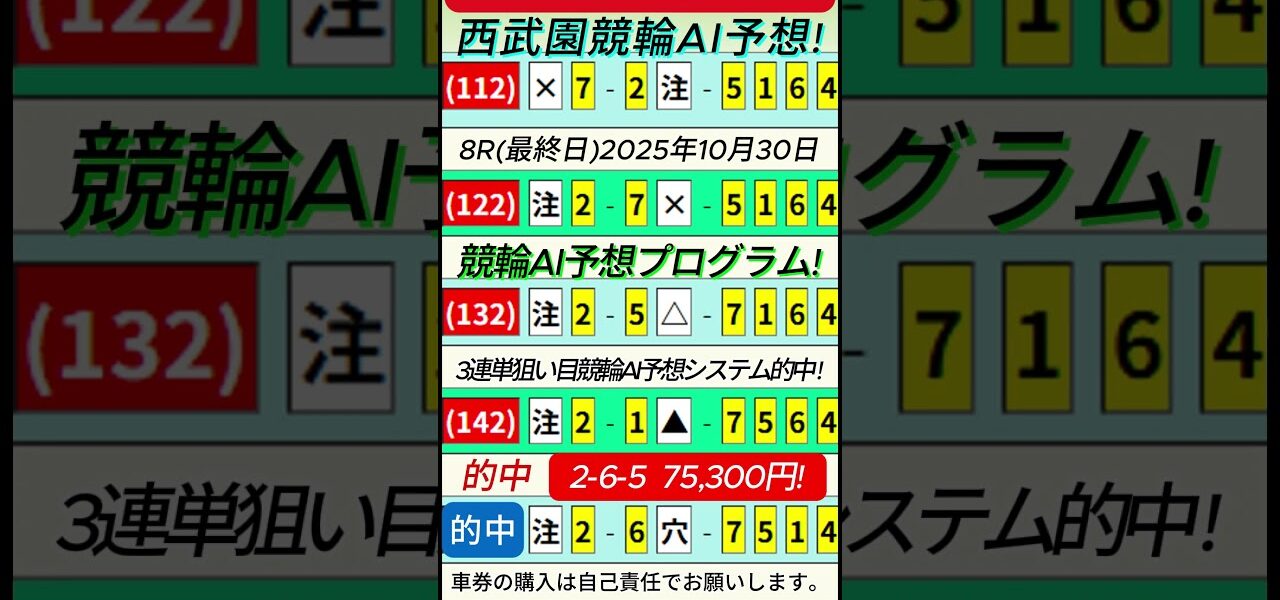 勝手に競輪予想スペシャル!西武園競輪AIプログラム!(最終日)8R 2025年10月30日3連単. 2-6-5 75,300円!ズバリ的中!😊