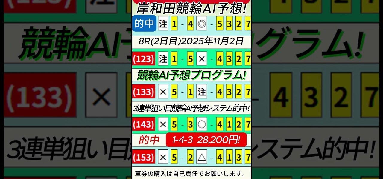 勝手に競輪予想スペシャル!岸和田競輪AIプログラム!(2日目)8R 2025年11月2日 3連単.1-4-3 28,200円!ズバリ的中!😊