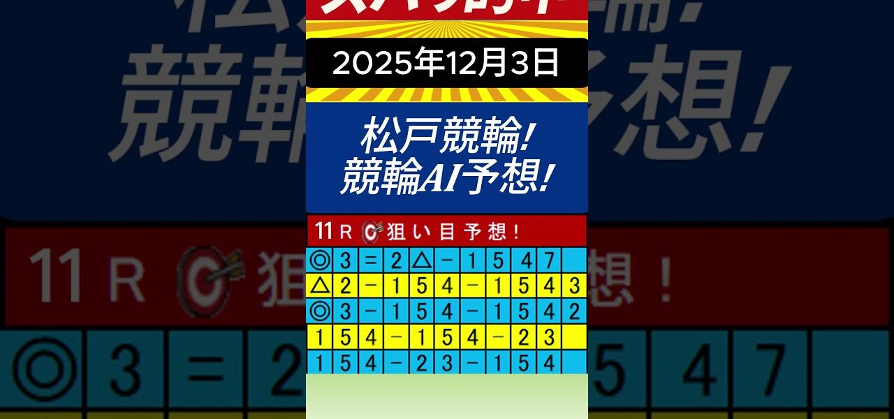 ホームページライブ勝手に競輪予想スペシャル!松戸競輪AI予想!2025年12月3日2日目11R 発走予定 20:02 投票締切 19:57 ライブ 勝手に競輪予想スペシャル!松戸競輪AI予想!2025年12月3日2日目11R 発走予定 20:02 投票締切 19:57 管理人 投稿日: 2025年12月3日 勝手に競輪予想スペシャル!松戸競輪AI予想!(2日目)11R予想してみました。 AI予想と組み合わせて競輪予想をしています。 車券の購入は自己責任でお願いします。 ご視聴頂きありがとうございます。 #shorts#勝手に競輪予想スペシャル!#松戸競輪#競輪#懐かしいパチンコ #ヨソカツ 競輪予想#競輪予想 競輪AI予想情報 https://www.youtube.com/@富士ライブチャンネル 共有: Facebook で共有するにはクリックしてください (新しいウィンドウで開きます) Facebook クリックして X で共有 (新しいウィンドウで開きます) X いいね:いいね 読み込み中… 返信する コメントをキャンセルメールアドレスが公開されることはありません。 ※ が付いている欄は必須項目ですコメント ※ 名前 ※ メール ※ サイト 次回のコメントで使用するためブラウザーに自分の名前、メールアドレス、サイトを保存する。 管理人 すべての投稿を表示 投稿ナビゲーション 前の投稿勝手に競輪予想スペシャル!松戸競輪AI予想!2025年12月3日2日目10R 2車単.5-1 2,910円!ズバリ的中!😊 次の投稿勝手に競輪予想スペシャル!松戸競輪AI予想!2025年12月3日2日目12R 発走予定 20:30 投票締切 20:25 こちらの記事はいかがですか? ライブ 【広島市営in玉野競輪】第37回古田泰久記念杯/日刊スポーツ新聞社杯[FⅠ] 11/20(月)【最終日】#玉野競輪ライブ #玉野競輪予想 #玉野競輪中継 管理人 2023年11月20日 ライブ 福井けいりんライブ 7月10日最終日GⅢ「福井競輪開設72周年記念」不死鳥杯 管理人 2022年7月10日 ライブ 【競輪ライブ】9/17(土)G2名古屋競輪 共同通信社杯(二日目)【競輪予想】 管理人 2022年9月17日 ライブ 笠松けいばライブ配信R7.03.20 管理人 2025年3月20日