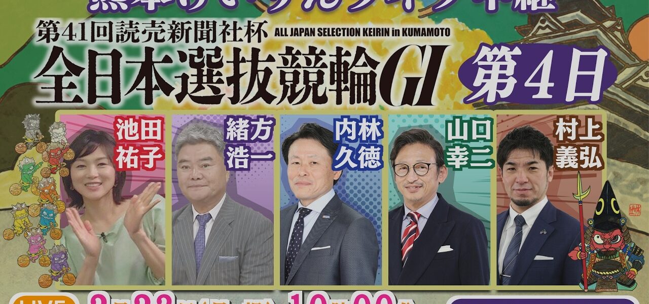 ホームページライブ2月23日 熊本けいりんライブ中継【GⅠ】第41回読売新聞社杯全日本選抜競輪 第4日【CS放送サイマル配信】 ライブ 2月23日 熊本けいりんライブ中継【GⅠ】第41回読売新聞社杯全日本選抜競輪 第4日【CS放送サイマル配信】 管理人 投稿日: 2026年2月23日 熊本けいりんライブ中継【GⅠ】第41回読売新聞社杯全日本選抜競輪 第4日の模様をお送りいたします。 放送予定時間は10:00~17:15となります。 #熊本けいりん #熊本競輪場 #競輪 #GⅠ #全日本選抜競輪 共有: Facebook で共有 (新しいウィンドウで開きます) Facebook X で共有 (新しいウィンドウで開きます) X いいね:いいね 読み込み中… 返信する コメントをキャンセルメールアドレスが公開されることはありません。 ※ が付いている欄は必須項目ですコメント ※ 名前 ※ メール ※ サイト 次回のコメントで使用するためブラウザーに自分の名前、メールアドレス、サイトを保存する。 管理人 すべての投稿を表示 投稿ナビゲーション 前の投稿【競輪ライブ2/23決勝】第41回全日本選抜競輪|ダブル王者・平原康多×三宅伸の決勝攻略! #G1 #熊本競輪場|Betimo公式競輪番組「Betimo KEIRIN Live」 次の投稿2/23 高知競輪ライブ【ガールズケイリン】#ガールズケイリン こちらの記事はいかがですか? ライブ 【競輪ライブ配信】 別府競輪 決勝 管理人 2025年7月30日 ライブ 【平塚競輪】平塚市営 楽天Kドリームス杯[FⅠナイター] 7/22(土)【2日目】#平塚競輪ライブ #平塚競輪中継 管理人 2023年7月18日 ライブ 取手競輪[FⅠ] サテライト水戸カップ・スポニチ新聞社杯 3日目 管理人 2025年1月14日 ライブ 藤田和彦選手3万車券(*゚∀゚)取手競輪競輪場 F2 12/17,18,19#競輪#ライブ配信#和歌山競輪♯元競輪選手 管理人 2026年1月28日