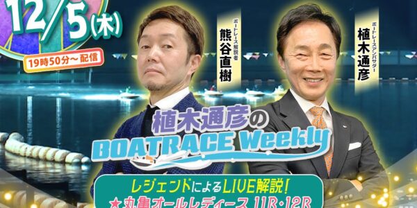 12月5日(木)19時50分から生配信!丸亀オールレディース11R・12RをLIVE解説!|植木通彦のボートレース ウィークリー|熊谷直樹さんが植木アンバサダーとナイターレースを紐解く!|ボートレース