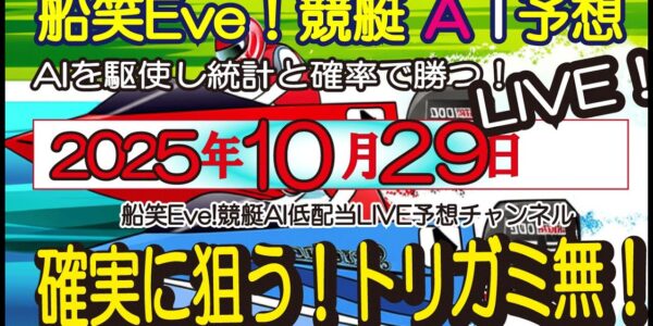[全ボートレースAI低額LIVE予想 】メイン配信 2025年10月29日(水) 船笑Eve!競艇AI低配当LIVE予想チャンネル 的中率重視!低配当のAIライブ予想!