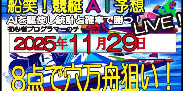 全ボートレースLIVE予想 2025年11月29日(土) 船笑!競艇AI予想 初心者プログラマーのチャンネル! 穴万舟8点・低額3点勝負!