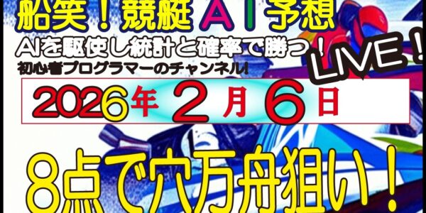 全ボートレースLIVE予想 2026年2月6日(金) 船笑!競艇AI予想 初心者プログラマーのチャンネル! 穴万舟8点・低額3点勝負!