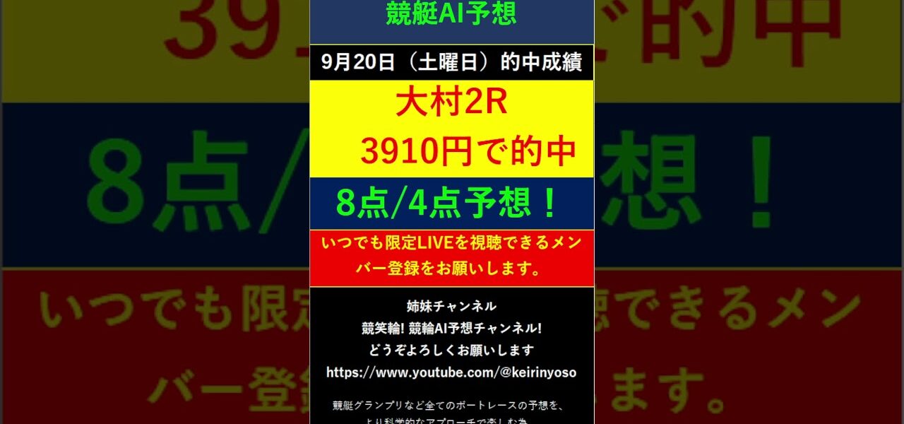 #Shorts【全ボートレースLIVE予想 】2025年9月20日予想分 結果のご案内です。ご視聴の皆様本日はお疲れ様でございました! また明日頑張りましょう! #競艇予想