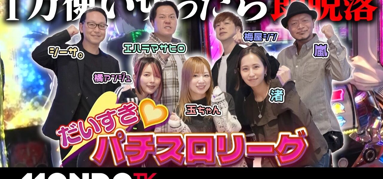 7人のスロッターがパチスロ対戦でリーグ制覇を目指す!メンバーは、エハラマサヒロ、嵐、梅屋シン、シーサ。、玉ちゃん、橘アンジュ、渚の7名。