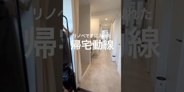 リノベで手に入れた帰宅動線◎M様邸築48年マンションリノベーション事例!玄関土間で上着やカバンなども収納!廊下にある洗面台で手洗いうがいして、ウォークスルークローゼットで着替えて洗濯物を洗濯機へ!