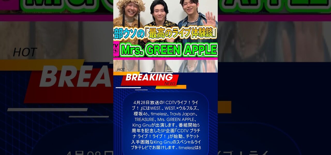 4月28日放送「CDTVライブ!ライブ!」、King Gnu、櫻坂46、Mrs. GREEN APPLE、TREASURE、timelesz、WEST.、ウルフルズ、Travis Japan出演