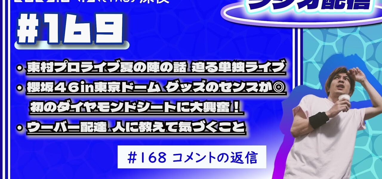 2025年07月31日【ラジオ配信】(#169) 東村プロライブ夏の陣の話迫る単独ライブ/櫻坂46in東京ドーム グッズのセンスが◎ 初のダイヤモンドシートに大興奮!/ウーバー配達人に教えて気づくこと