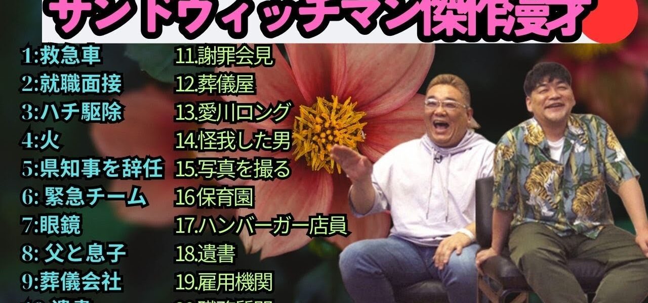 広告無し】サンドウィッチマン 傑作漫才+コント #61【睡眠用・作業用・高音質BGM聞き流し】(概要欄タイムスタンプ有り) サンドウィッチマン (Sandwichman) は、伊達みきお と 富澤たけし による日本のお笑いコンビで、テンポの良い掛け合いと爆笑必至の漫才で多くのファンを魅了しています。1998年に結成され、2007年に M-1グランプリ優勝 を果たし、一気に全国区の人気芸人となりました。漫才やコントはもちろん、テレビ、ラジオ、YouTube でも大活躍し、幅広い世代から支持を集めています。彼らのネタは「笑い」だけでなく、温かさや人間味も感じさせ、唯一無二の存在としてお笑い界をリードし続けています。 この動画では、サンドウィッチマンの魅力あふれる漫才・コント・トークをお届けします。爆笑シーン、感動シーン、そしてテレビやラジオでの人気企画など、サンドウィッチマンを楽しみたい方にぴったりの内容です。お笑い好き、漫才ファン、M-1グランプリをきっかけに彼らを知った方も、ぜひ最後までご覧ください! サンドウィッチマン, Sandwichman, 伊達みきお, 富澤たけし, お笑いコンビ, 漫才, 漫才師, M1グランプリ, M1優勝, 日本のお笑い, 人気芸人, バラエティ番組, お笑い芸人, コント, 芸人動画, 爆笑漫才, お笑いネタ, テレビ出演, 漫才ネタ, ラジオ番組, 日本のコメディ, 人気コンビ, お笑い好き, 笑い, 芸人トーク, 爆笑, エンタメ, Japanese Comedy, Manzai, Comedy Duo, Funny Japan, Standup Japan, Comedy Show, Japanese TV, 漫才コント, 爆笑コンビ #サンドウィッチマン #Sandwichman #伊達みきお #富澤たけし #お笑い #漫才 #M1グランプリ #人気芸人 #お笑い芸人 #コント #爆笑 #お笑いコンビ #バラエティ #芸人動画 #漫才ネタ #ラジオ番組 #日本のお笑い #ComedyJapan #Manzai #JapaneseComedy #FunnyJapan #StandupJapan #ComedyDuo #お笑い好き #エンタメ #サンドウィッチマン2025