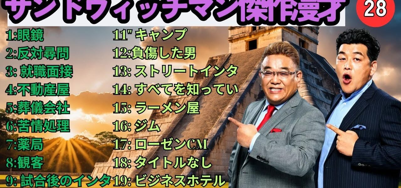 広告無し】サンドウィッチマン 傑作漫才+コント #61【睡眠用・作業用・高音質BGM聞き流し】(概要欄タイムスタンプ有り) サンドウィッチマン (Sandwichman) は、伊達みきお と 富澤たけし による日本のお笑いコンビで、テンポの良い掛け合いと爆笑必至の漫才で多くのファンを魅了しています。1998年に結成され、2007年に M-1グランプリ優勝 を果たし、一気に全国区の人気芸人となりました。漫才やコントはもちろん、テレビ、ラジオ、YouTube でも大活躍し、幅広い世代から支持を集めています。彼らのネタは「笑い」だけでなく、温かさや人間味も感じさせ、唯一無二の存在としてお笑い界をリードし続けています。 この動画では、サンドウィッチマンの魅力あふれる漫才・コント・トークをお届けします。爆笑シーン、感動シーン、そしてテレビやラジオでの人気企画など、サンドウィッチマンを楽しみたい方にぴったりの内容です。お笑い好き、漫才ファン、M-1グランプリをきっかけに彼らを知った方も、ぜひ最後までご覧ください! サンドウィッチマン, Sandwichman, 伊達みきお, 富澤たけし, お笑いコンビ, 漫才, 漫才師, M1グランプリ, M1優勝, 日本のお笑い, 人気芸人, バラエティ番組, お笑い芸人, コント, 芸人動画, 爆笑漫才, お笑いネタ, テレビ出演, 漫才ネタ, ラジオ番組, 日本のコメディ, 人気コンビ, お笑い好き, 笑い, 芸人トーク, 爆笑, エンタメ, Japanese Comedy, Manzai, Comedy Duo, Funny Japan, Standup Japan, Comedy Show, Japanese TV, 漫才コント, 爆笑コンビ #サンドウィッチマン #Sandwichman #伊達みきお #富澤たけし #お笑い #漫才 #M1グランプリ #人気芸人 #お笑い芸人 #コント #爆笑 #お笑いコンビ #バラエティ #芸人動画 #漫才ネタ #ラジオ番組 #日本のお笑い #ComedyJapan #Manzai #JapaneseComedy #FunnyJapan #StandupJapan #ComedyDuo #お笑い好き #エンタメ #サンドウィッチマン2025