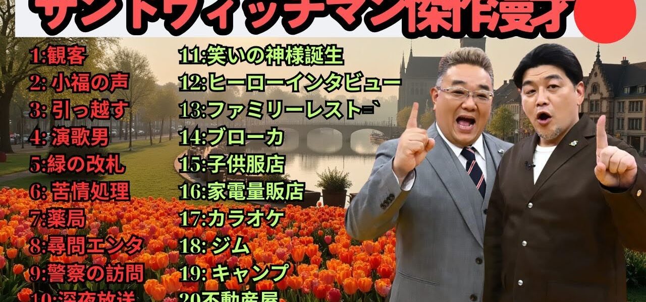広告無し】サンドウィッチマン 傑作漫才+コント #61【睡眠用・作業用・高音質BGM聞き流し】(概要欄タイムスタンプ有り) サンドウィッチマン (Sandwichman) は、伊達みきお と 富澤たけし による日本のお笑いコンビで、テンポの良い掛け合いと爆笑必至の漫才で多くのファンを魅了しています。1998年に結成され、2007年に M-1グランプリ優勝 を果たし、一気に全国区の人気芸人となりました。漫才やコントはもちろん、テレビ、ラジオ、YouTube でも大活躍し、幅広い世代から支持を集めています。彼らのネタは「笑い」だけでなく、温かさや人間味も感じさせ、唯一無二の存在としてお笑い界をリードし続けています。 この動画では、サンドウィッチマンの魅力あふれる漫才・コント・トークをお届けします。爆笑シーン、感動シーン、そしてテレビやラジオでの人気企画など、サンドウィッチマンを楽しみたい方にぴったりの内容です。お笑い好き、漫才ファン、M-1グランプリをきっかけに彼らを知った方も、ぜひ最後までご覧ください! サンドウィッチマン, Sandwichman, 伊達みきお, 富澤たけし, お笑いコンビ, 漫才, 漫才師, M1グランプリ, M1優勝, 日本のお笑い, 人気芸人, バラエティ番組, お笑い芸人, コント, 芸人動画, 爆笑漫才, お笑いネタ, テレビ出演, 漫才ネタ, ラジオ番組, 日本のコメディ, 人気コンビ, お笑い好き, 笑い, 芸人トーク, 爆笑, エンタメ, Japanese Comedy, Manzai, Comedy Duo, Funny Japan, Standup Japan, Comedy Show, Japanese TV, 漫才コント, 爆笑コンビ #サンドウィッチマン #Sandwichman #伊達みきお #富澤たけし #お笑い #漫才 #M1グランプリ #人気芸人 #お笑い芸人 #コント #爆笑 #お笑いコンビ #バラエティ #芸人動画 #漫才ネタ #ラジオ番組 #日本のお笑い #ComedyJapan #Manzai #JapaneseComedy #FunnyJapan #StandupJapan #ComedyDuo #お笑い好き #エンタメ #サンドウィッチマン2025