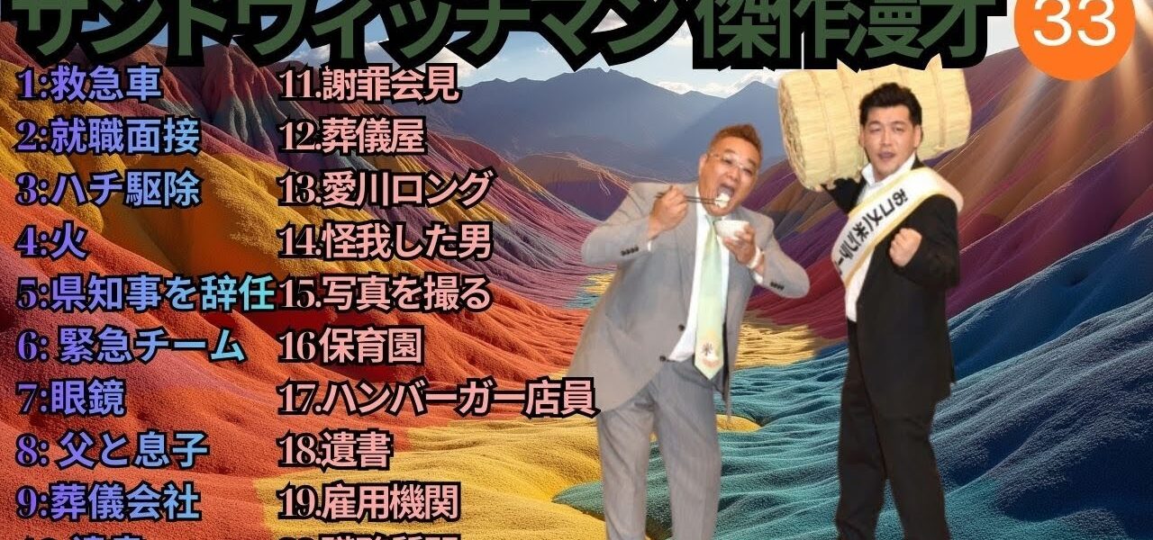 広告無し】サンドウィッチマン 傑作漫才+コント #61【睡眠用・作業用・高音質BGM聞き流し】(概要欄タイムスタンプ有り) サンドウィッチマン (Sandwichman) は、伊達みきお と 富澤たけし による日本のお笑いコンビで、テンポの良い掛け合いと爆笑必至の漫才で多くのファンを魅了しています。1998年に結成され、2007年に M-1グランプリ優勝 を果たし、一気に全国区の人気芸人となりました。漫才やコントはもちろん、テレビ、ラジオ、YouTube でも大活躍し、幅広い世代から支持を集めています。彼らのネタは「笑い」だけでなく、温かさや人間味も感じさせ、唯一無二の存在としてお笑い界をリードし続けています。 この動画では、サンドウィッチマンの魅力あふれる漫才・コント・トークをお届けします。爆笑シーン、感動シーン、そしてテレビやラジオでの人気企画など、サンドウィッチマンを楽しみたい方にぴったりの内容です。お笑い好き、漫才ファン、M-1グランプリをきっかけに彼らを知った方も、ぜひ最後までご覧ください! サンドウィッチマン, Sandwichman, 伊達みきお, 富澤たけし, お笑いコンビ, 漫才, 漫才師, M1グランプリ, M1優勝, 日本のお笑い, 人気芸人, バラエティ番組, お笑い芸人, コント, 芸人動画, 爆笑漫才, お笑いネタ, テレビ出演, 漫才ネタ, ラジオ番組, 日本のコメディ, 人気コンビ, お笑い好き, 笑い, 芸人トーク, 爆笑, エンタメ, Japanese Comedy, Manzai, Comedy Duo, Funny Japan, Standup Japan, Comedy Show, Japanese TV, 漫才コント, 爆笑コンビ #サンドウィッチマン #Sandwichman #伊達みきお #富澤たけし #お笑い #漫才 #M1グランプリ #人気芸人 #お笑い芸人 #コント #爆笑 #お笑いコンビ #バラエティ #芸人動画 #漫才ネタ #ラジオ番組 #日本のお笑い #ComedyJapan #Manzai #JapaneseComedy #FunnyJapan #StandupJapan #ComedyDuo #お笑い好き #エンタメ #サンドウィッチマン2025