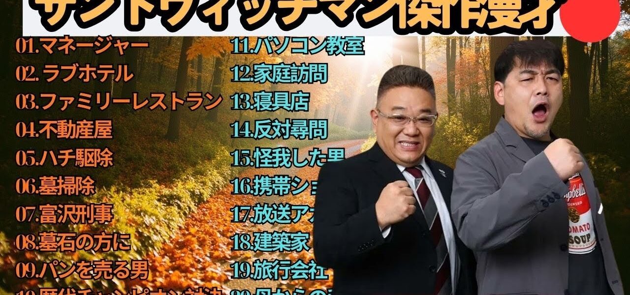 広告無し】サンドウィッチマン 傑作漫才+コント #61【睡眠用・作業用・高音質BGM聞き流し】(概要欄タイムスタンプ有り) サンドウィッチマン (Sandwichman) は、伊達みきお と 富澤たけし による日本のお笑いコンビで、テンポの良い掛け合いと爆笑必至の漫才で多くのファンを魅了しています。1998年に結成され、2007年に M-1グランプリ優勝 を果たし、一気に全国区の人気芸人となりました。漫才やコントはもちろん、テレビ、ラジオ、YouTube でも大活躍し、幅広い世代から支持を集めています。彼らのネタは「笑い」だけでなく、温かさや人間味も感じさせ、唯一無二の存在としてお笑い界をリードし続けています。 この動画では、サンドウィッチマンの魅力あふれる漫才・コント・トークをお届けします。爆笑シーン、感動シーン、そしてテレビやラジオでの人気企画など、サンドウィッチマンを楽しみたい方にぴったりの内容です。お笑い好き、漫才ファン、M-1グランプリをきっかけに彼らを知った方も、ぜひ最後までご覧ください! サンドウィッチマン, Sandwichman, 伊達みきお, 富澤たけし, お笑いコンビ, 漫才, 漫才師, M1グランプリ, M1優勝, 日本のお笑い, 人気芸人, バラエティ番組, お笑い芸人, コント, 芸人動画, 爆笑漫才, お笑いネタ, テレビ出演, 漫才ネタ, ラジオ番組, 日本のコメディ, 人気コンビ, お笑い好き, 笑い, 芸人トーク, 爆笑, エンタメ, Japanese Comedy, Manzai, Comedy Duo, Funny Japan, Standup Japan, Comedy Show, Japanese TV, 漫才コント, 爆笑コンビ #サンドウィッチマン #Sandwichman #伊達みきお #富澤たけし #お笑い #漫才 #M1グランプリ #人気芸人 #お笑い芸人 #コント #爆笑 #お笑いコンビ #バラエティ #芸人動画 #漫才ネタ #ラジオ番組 #日本のお笑い #ComedyJapan #Manzai #JapaneseComedy #FunnyJapan #StandupJapan #ComedyDuo #お笑い好き #エンタメ #サンドウィッチマン2025