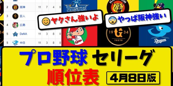 【最新】プロ野球セ・リーグ順位表 4月8日版|横浜4-6中日|阪神2-3ヤク|広島1-2巨人|【まとめ・なんJ・2ch】
