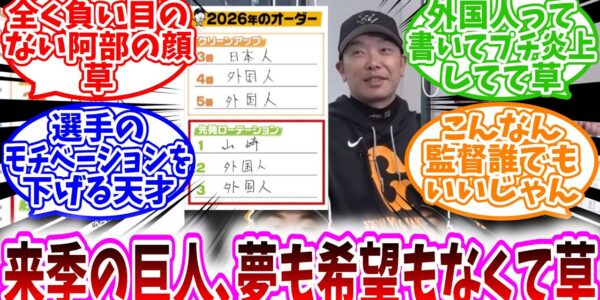 【プロ野球反応集】「来季の巨人、夢も希望もなくて草」に対する野球民の反応集/全く負い目のない阿部の顔草/外国人って書いてプチ炎上してて草/選手のモチベーションを下げる天才/こんなん監督誰でもいいじゃん