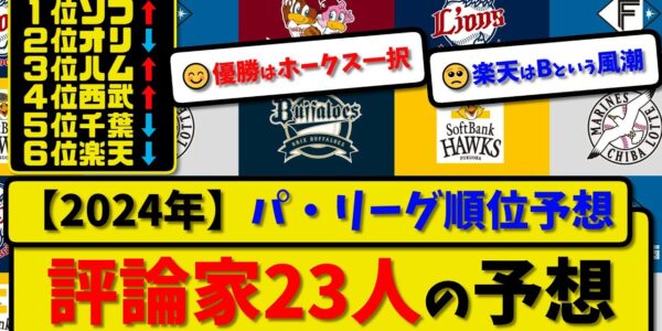 【評論家23人順位予想】プロ野球パ・リーグ 2024順位予想 3月26日版▶評論家23人の予想◀【まとめ・反応集・2ch・なんJ】