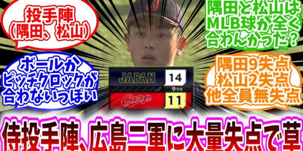 【プロ野球反応集】「侍JAPAN投手陣、広島二軍に大量失点で草」に対する、野球民の反応集/投手陣(隅田、松山)/隅田9失点松山2失点他全員無失点/隅田と松山はボールかピッチクロックが合わないっぽい?