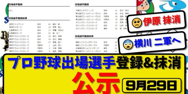【公示】プロ野球 出場選手登録&抹消 公示9月29日発表|横川&伊原&常廣&髙&奥川&石川&高橋&山田&川端&塩見&柳&大野&尾形&周東&伏見&藤井ら抹消|石川&中込&吉納&吉野&寺西&山田&堀ら登録