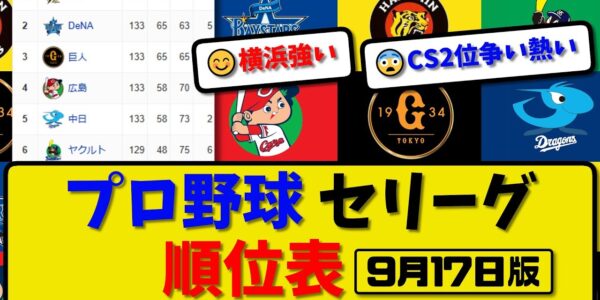 【最新】プロ野球セ・リーグ順位表 9月17日版|ヤク2-4巨人|中日0-1横浜|広島1-6阪神|【まとめ・反応集・なんJ・2ch】