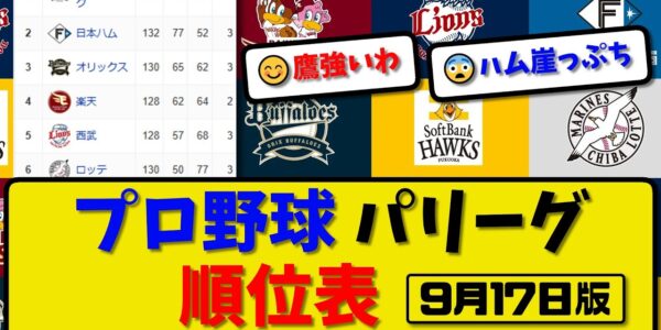 【最新】プロ野球パ・リーグ順位表 9月17日版|ヤク楽天3-2ハム|オリ1-2ロッテ|ソフ11-8西武|【まとめ・反応集・なんJ・2ch】