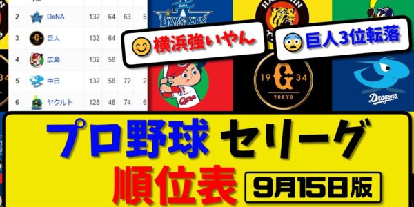 【最新】プロ野球セ・リーグ順位表 9月15日版|阪神6-2中日|広島6-2ヤク|横浜3-0巨人|【まとめ・反応集・なんJ・2ch】