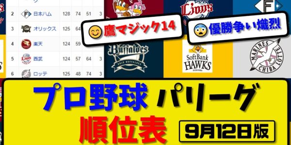 【最新】プロ野球パ・リーグ順位表 9月12日版|ハム3-7西武|楽天6-3ロッテ|ソフ|オリ|【まとめ・反応集・なんJ・2ch】