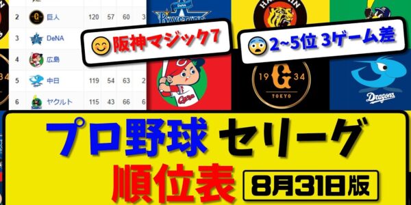 【最新】プロ野球セ・リーグ順位表 8月31日版|ヤク7-4広島|横浜2-0中日|阪神5-4巨人|【まとめ・反応集・なんJ・2ch】