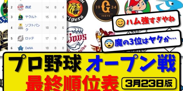 【最新】プロ野球オープン戦 最終順位表 3月23日版…|ハム7-4ヤク|オリ2-1阪神|中日1-3楽天|西武4-2横浜|巨人1-2ロッテ|広島1-3ソフ|【まとめ・反応集・なんJ・2ch】