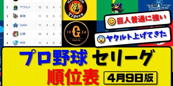 【最新】プロ野球セ・リーグ順位表 4月9日版|横浜3-6巨人|中日3-1広島|阪神3-5ヤク|【まとめ・反応集・なんJ・2ch】