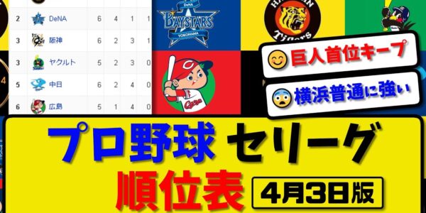 【最新】プロ野球セ・リーグ順位表 4月3日版|ヤク3-0広島|中日3-5巨人|阪神2-5横浜|【まとめ・反応集・なんJ・2ch】