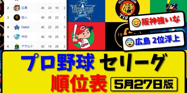 【最新】プロ野球セ・リーグ順位表 5月27日版|巨人1-2広島|ヤク2-1中日|阪神1-0横浜|【まとめ・反応集・なんJ・2ch】