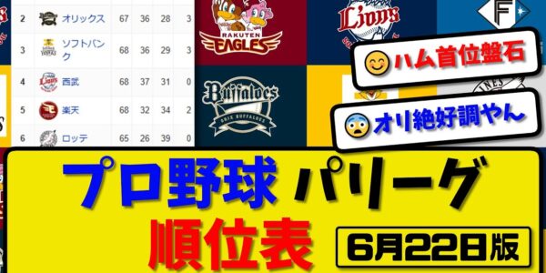 【最新】プロ野球パ・リーグ順位表 6月22日版|ハム1-4中日|オリ4-2ヤク|ソフ3-1阪神|西武5-0巨人|楽天2-5広島|ロッテ10-9横浜|【まとめ・反応集・なんJ・2ch】