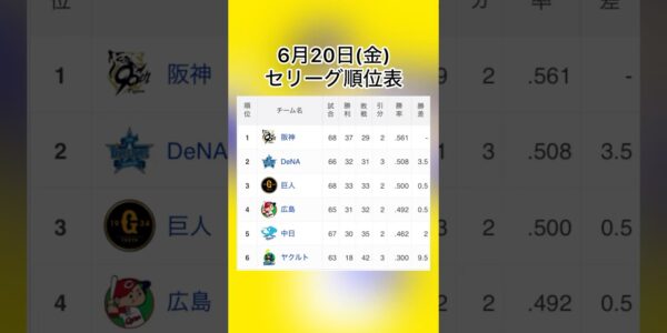 6月20日セリーグ順位表 #プロ野球