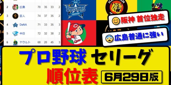 【最新】プロ野球セ・リーグ順位表 6月29日版|ヤク0-6阪神|中日1-2広島|巨人1-0横浜|【まとめ・反応集・なんJ・2ch】